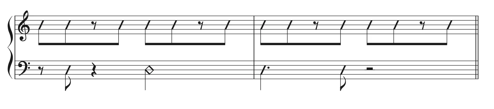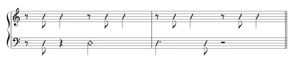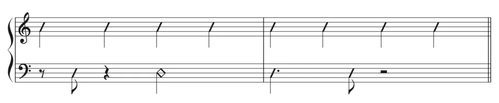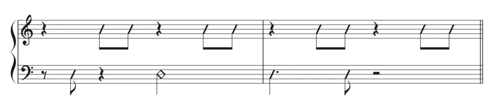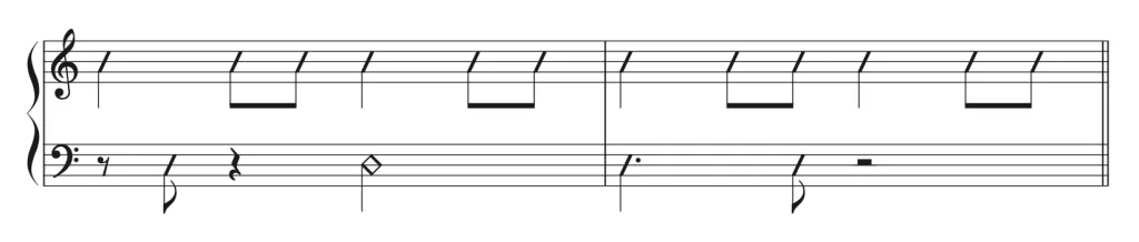 左手のタイミングが理解できたところで、右手のリズムが変わっても左手のリズムがキープできるように訓練していきましょう。