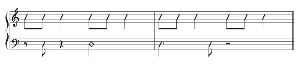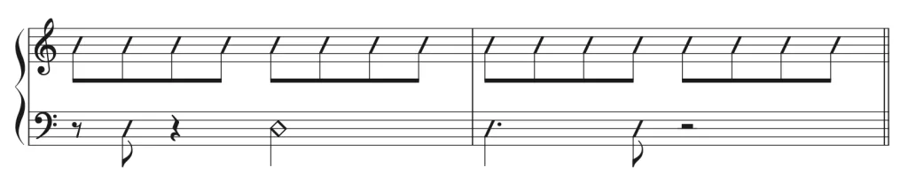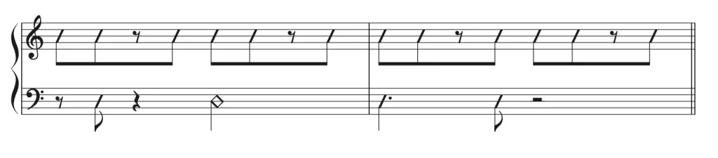 次は少し実践的に右手のリズムパターンとのコンビネーションで練習してみよう。