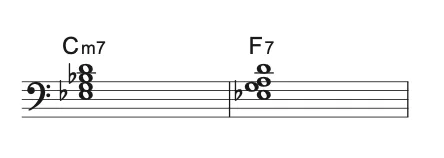 以降の動画ではコード進行は|Cm7|F7|の繰り返しで、右手はドの音のみ、左手は同じボイシングを繰り返しています。
